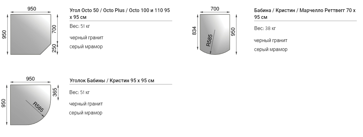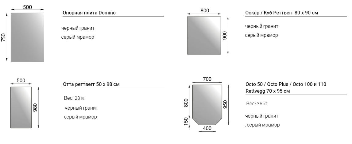 Мы предлагаем два основных типа подложек: черный гранит высшего качества с высокой степенью полировки и крапчатый темно-серый песчаник, который обладает менее выраженной полировкой.